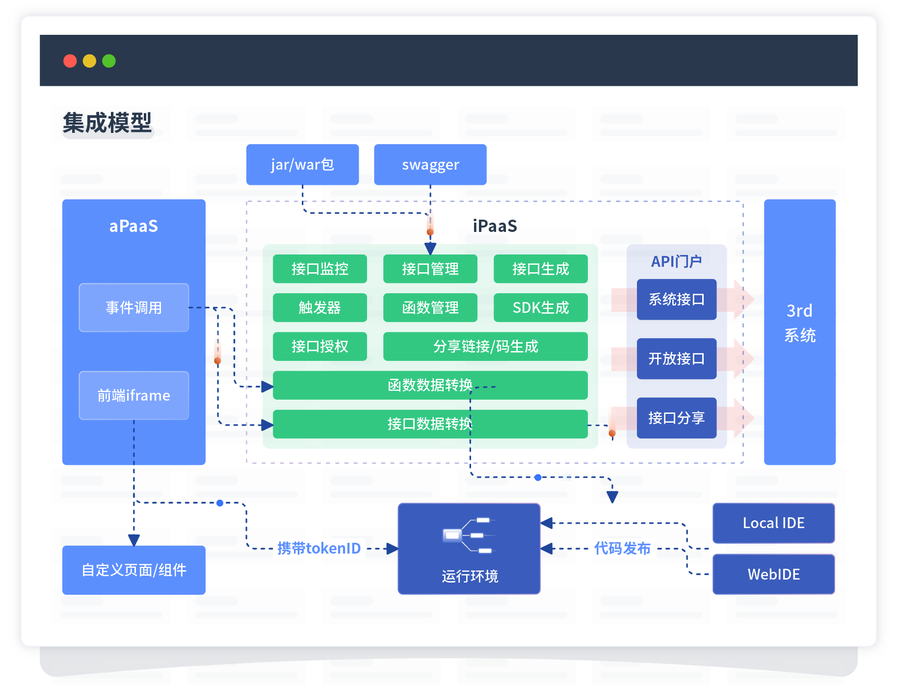集成模型包括平台本身前、、、、、、、、后端能力的扩展,,,,,,,,,,也支持通过API门户和第三方系统进行交互。。。。。。。