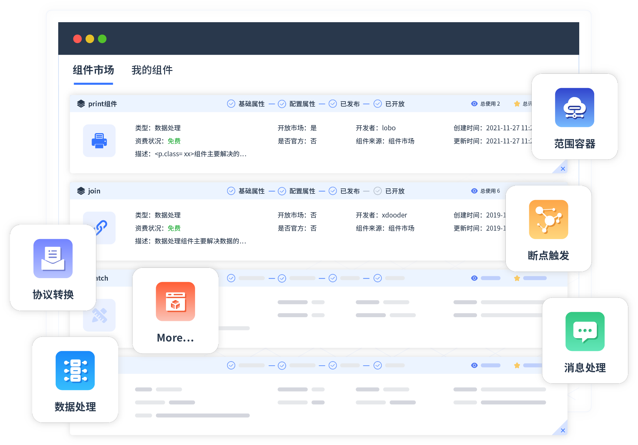 针对集成场景,,,,,,,,,,,,华为钱包提供组件市场,,,,,例如协议转换、、、、消息处理、、、、、、、、、、、文件操作等。。。。。。。。。。。。。除平台提供的组件外,,,,,,,,,,客户可以自定义所需组件。。。。。。。。