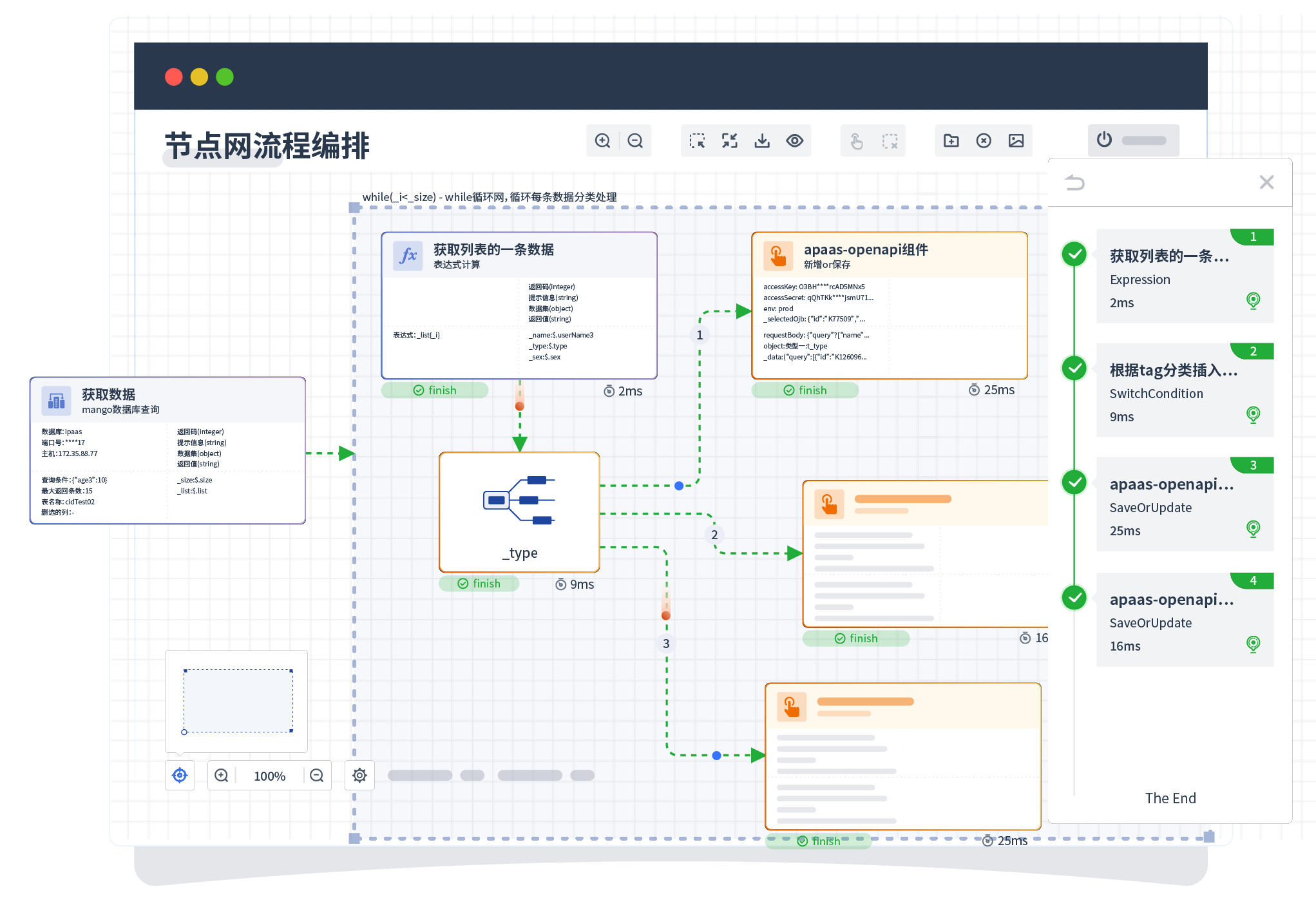 针对集成场景,,,,,,组件定义后支持进行流程编制,,,,不同于传统代码方式,,,,,,,通过图形化展示,,,,,,,,,支持在线调试、、、、、、、日志查看和运行回放。。。。。。。。。。